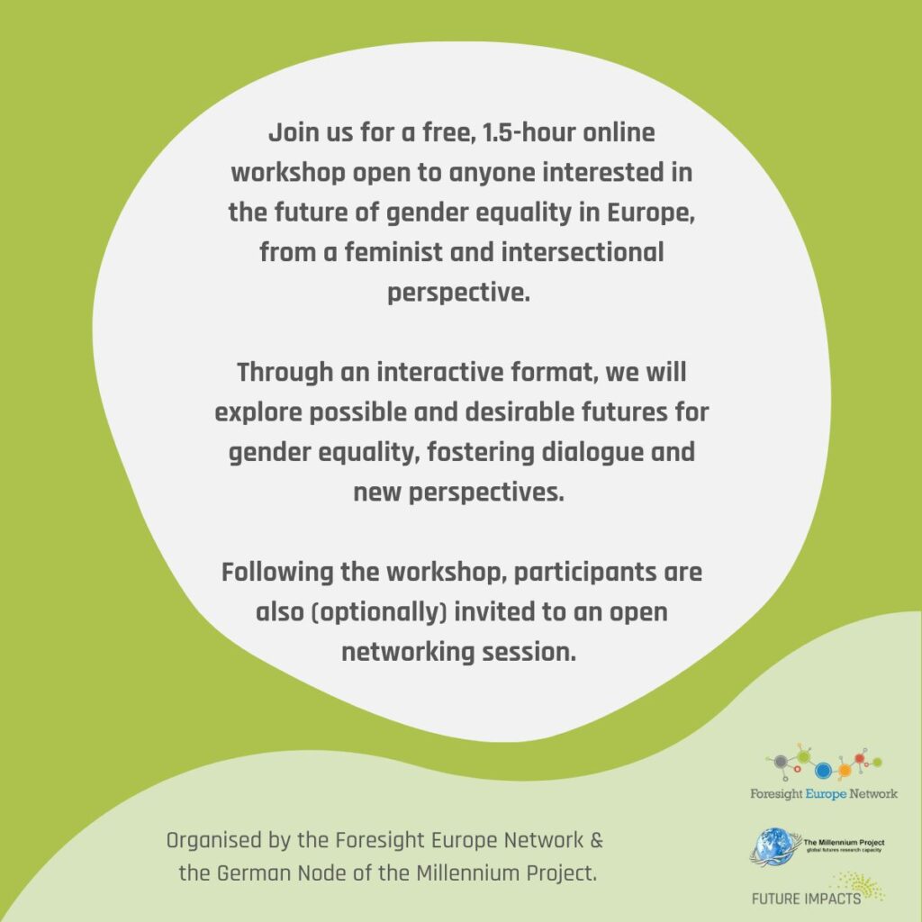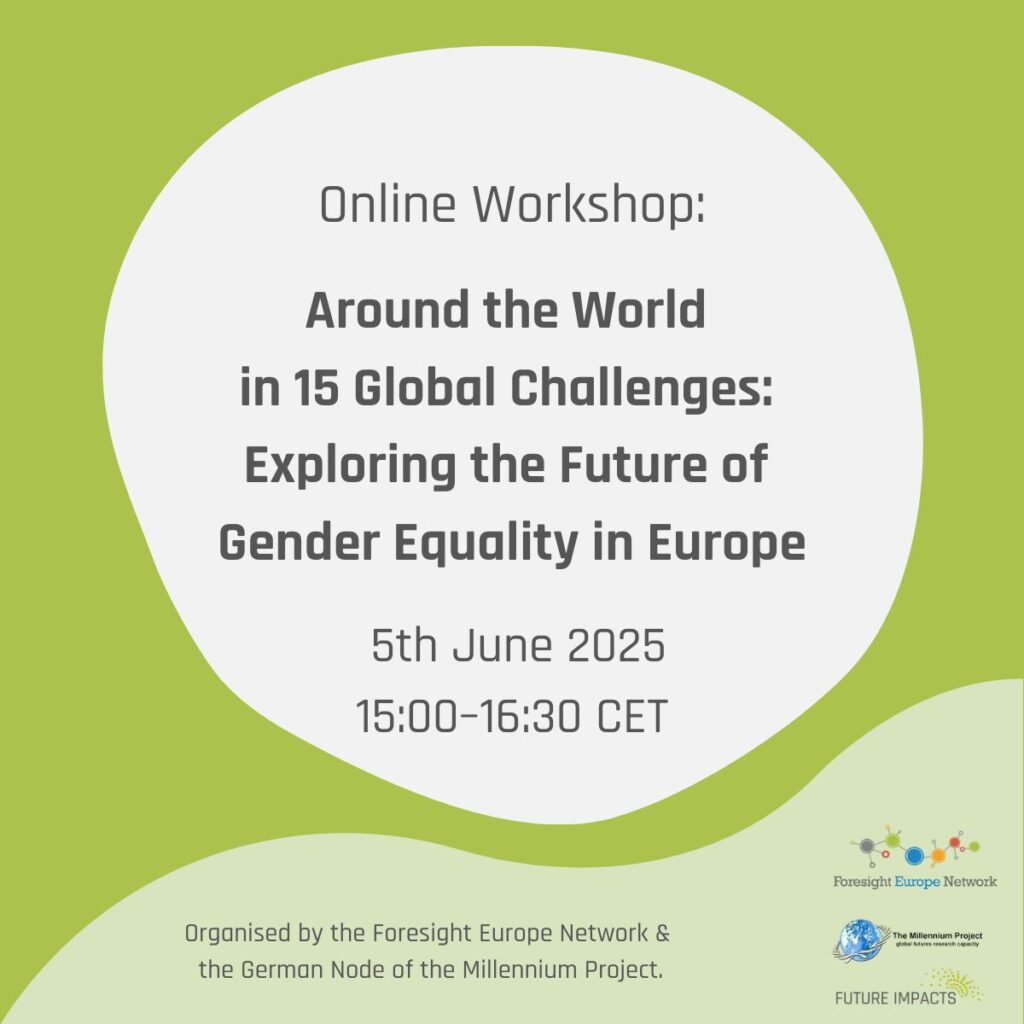 The Germany Node and the Foresight Europe Network of The Millennium Project are organizing an amazing 1.5-hour online workshop on “Exploring the Future of Gender Equality in Europe” on June 5, 2025, 3pm – 4:30pm CEST.