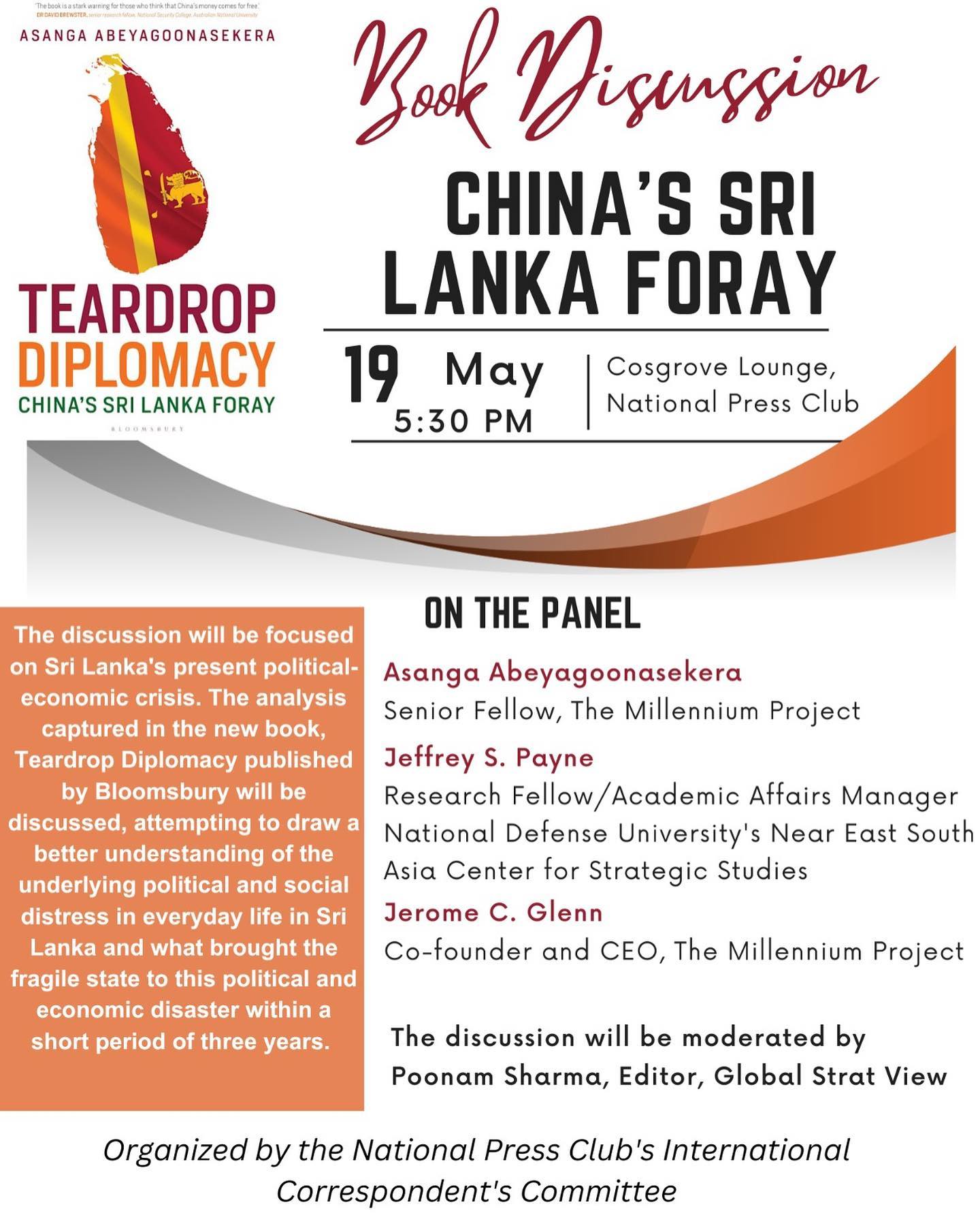 On May 19, 2023, the National Press Club’s International Correspondent’s Committee organized a meeting on “China’s Sri Lanka Foray“, a book discussion on the recent publication called “Teardrop Diplomacy” by Asanga Abeyagoonasekera, President of the South Asia Foresight Network and Chair of the Sri Lanka Node of The Millennium Project.