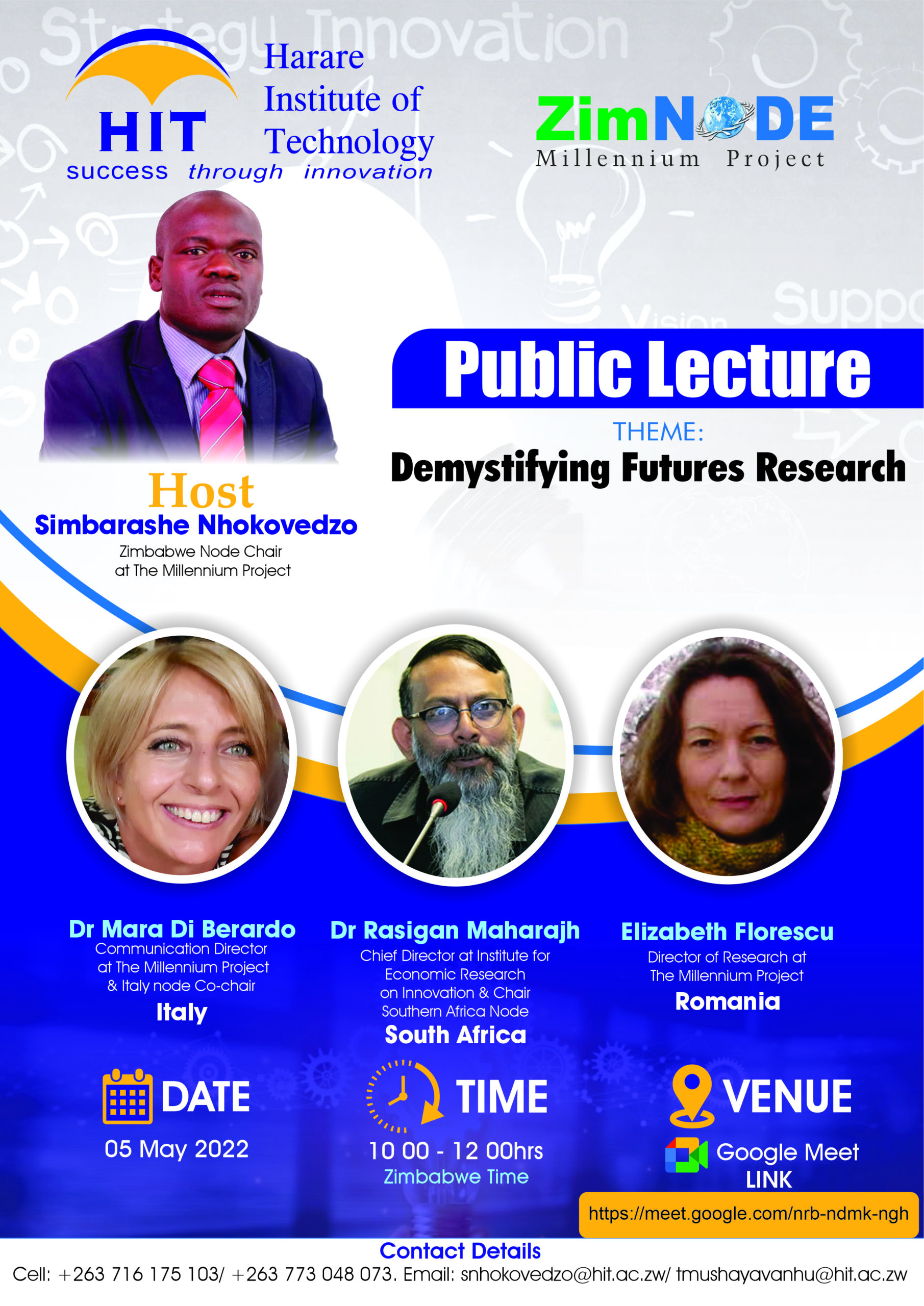 The Zimbabwe Node of The Millennium Project at the Harare Institute of Technology, chaired by Simbarashe Nhokovedzo, is organizing a Public Lecture about “Demystifying Futures Research” on May 5, 2022.