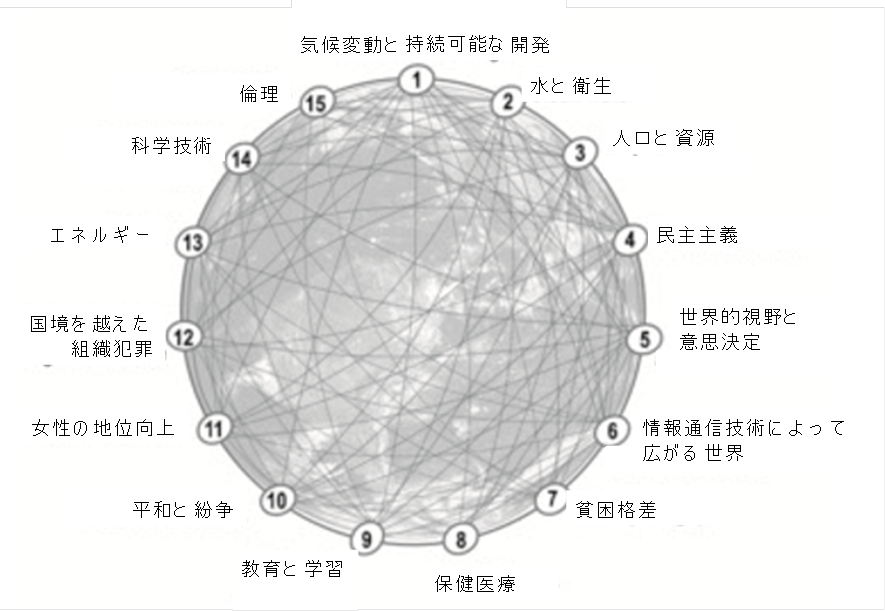 15のグローバルチャレンジは、人類の未来にかかる重要テーマの地球規模および各地域の見通しを評価するためのフレームワークである。各チャレンジは相互に関連しており、 一つが改善されると他の問題への対処がより簡単になる。逆に、一つの状況が悪化すれば他の問題に対処することが難しくなる。あるチャレンジが他のチャレンジよりも重要であるかと主張するのは、人間の神経系が呼吸器系より重要であると主張することに似ている。