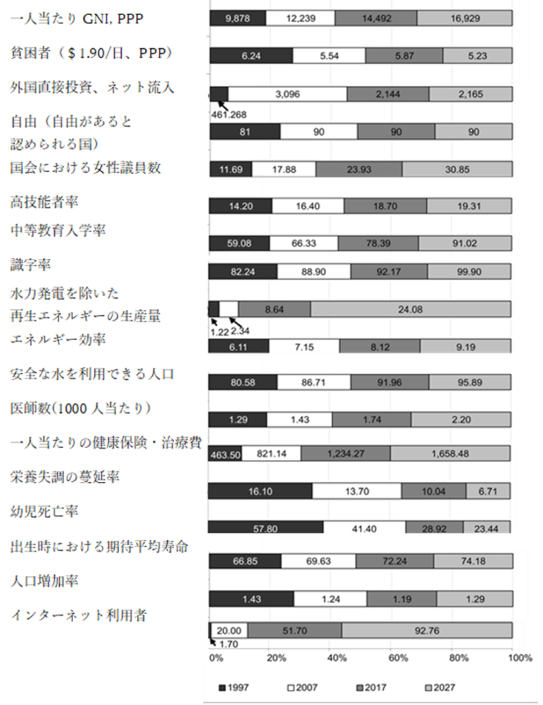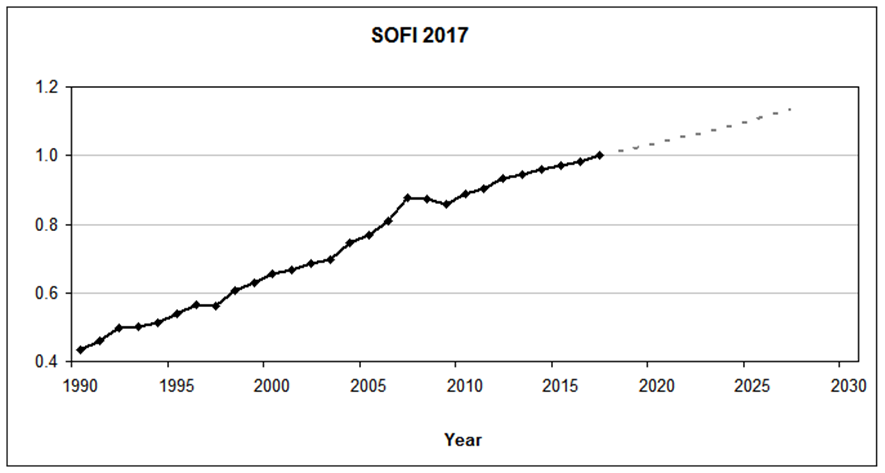 2017年のSOFI(図1)は、過去27年間よりも遅いペースではあるが、世界は全般的に改善し続けていることを示している。今後10年間の世界的な改善率は、1990年から2017年の間の3.14%に対し、1.14%になるだろう。これは主に、2008年の金融危機後の回復の遅れと2009年の世界不況によるものである。2017年の報告に大きな影響を与えた要因にテロ攻撃の数があるが、これは非常に予測が難しいものである。テロを封じ込めることができれば、SOFIはかなり良く見えることになるだろう。第3章では、将来のテロリズムとその抑止に関する世界中の専門家の見解を紹介する。