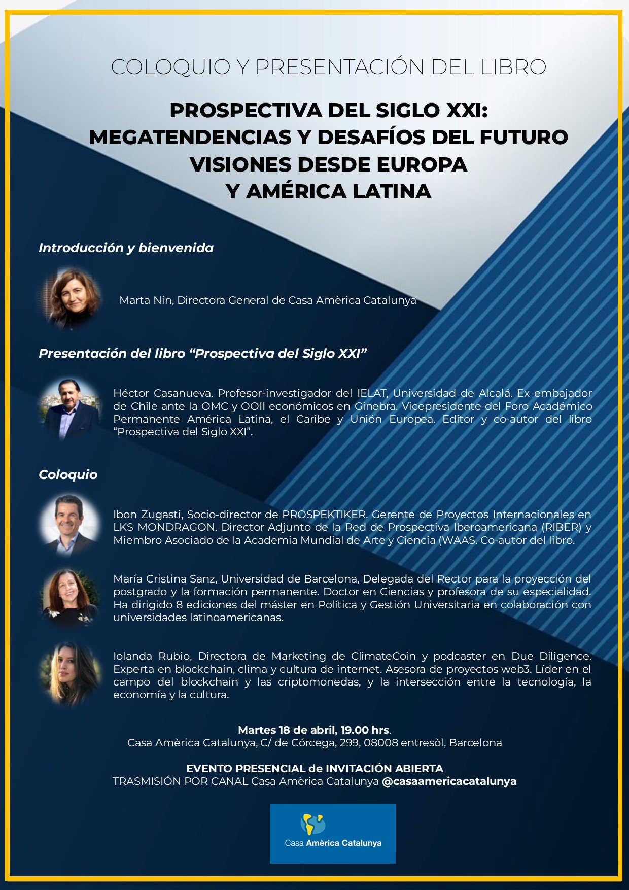 On April 18, 2023, the Casa Amèrica Catalunya will host a seminar on “Prospectiva del siglo XXI: megatendencias y Desafíos del futuro, visiones desde Europa y América Latina” in Barcelona.
