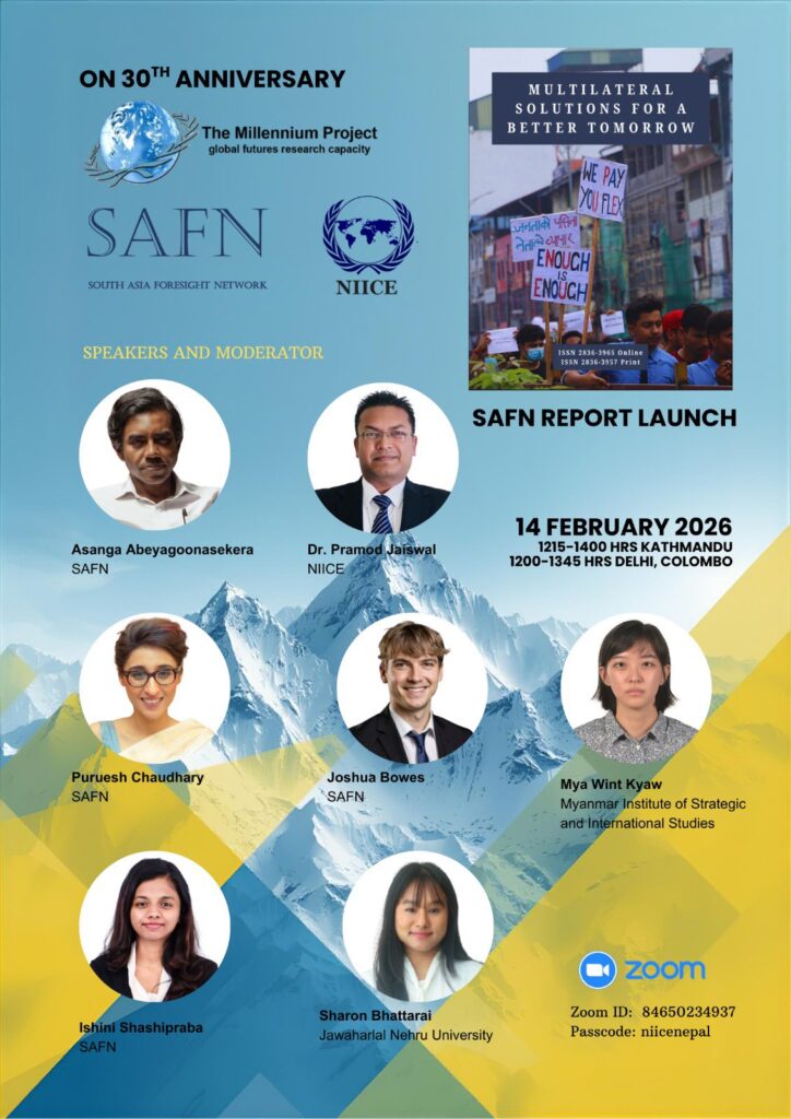 On the occasion of the 30th Anniversary of The Millennium Project on February 14, 2026, SAFN will officially launch its flagship publication, “Multilateral Solutions for a Better Tomorrow”, during a public online event organized in partnership with the Nepal Institute for International Cooperation and Engagement (NIICE), hosting the Nepal Node of The Millennium Project.