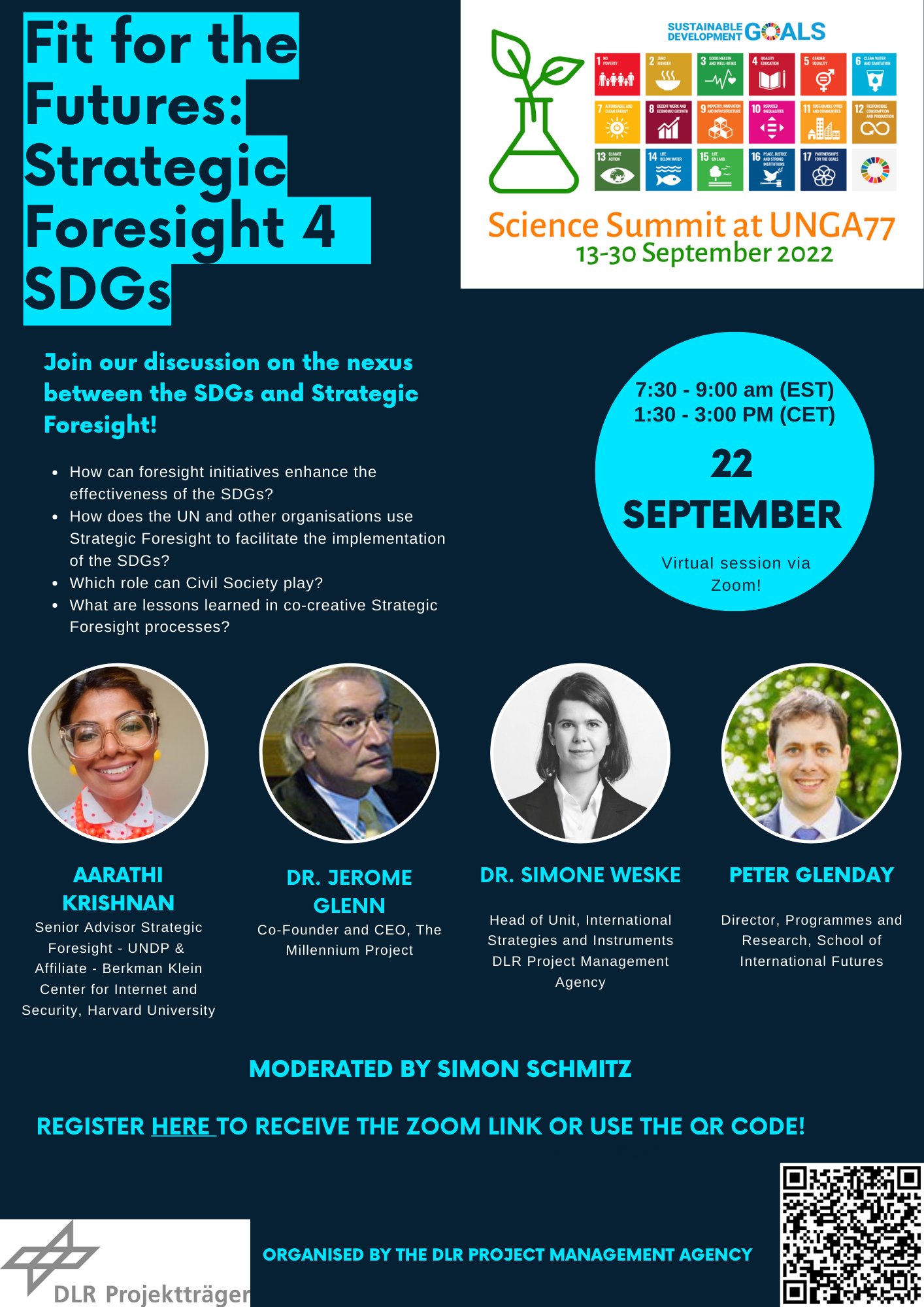 Within this event, a specific session about “Fit for the futures: Strategic Foresight 4 SDGs“, organized by the German Aerospace Centre- Projektträger (DLR-PT), will take place online in September 22, 2022 at 1:30pm – 3:00pm (CEST) / 7:30am – 9:00am (EST).