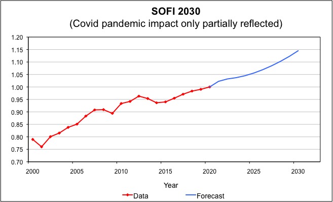 A one-to-one comparison with the SOFIs prepared in earlier years would be misleading, since some of the variables have changed. Overall, however, the shape of 2030 SOFI is similar to earlier ones, but with a slower growth rate for the coming decade, while the impact of the Covid-19 pandemic is not even fully captured (since some indicators take longer to be updated at a global level.)
