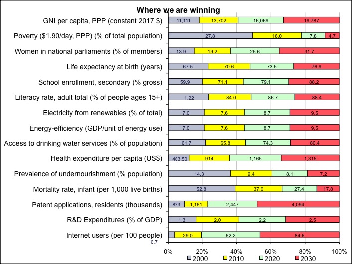 One of the advantages of computing the SOFI is the identification of the areas where we are winning, losing, or stagnating—thereby helping set priorities. Figures 3 and 4 show where humanity is making progress and where more political attention and efforts are needed.